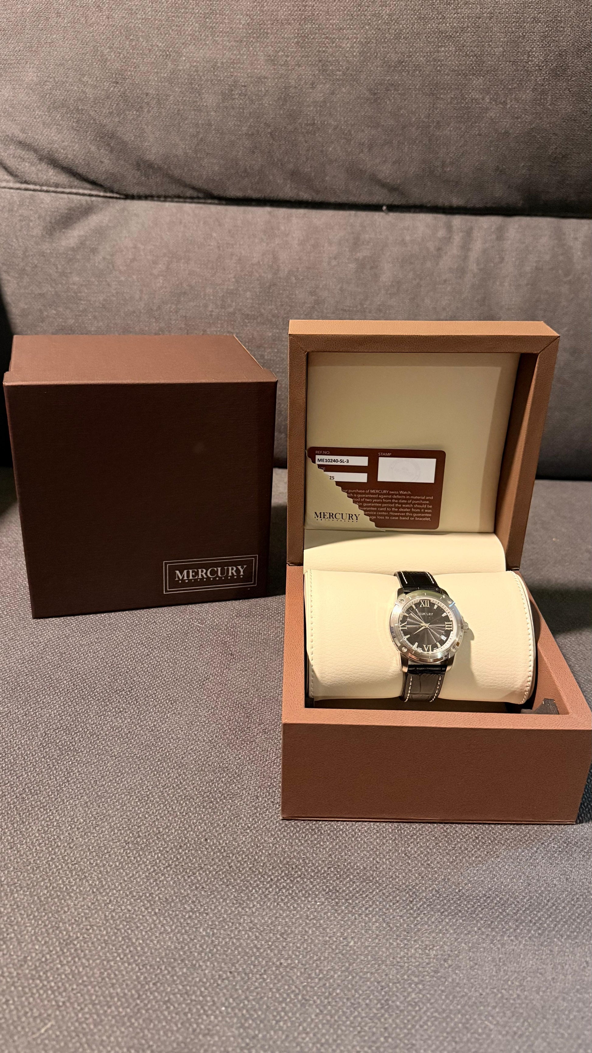 El reloj Mercury en la caja parece ser un modelo de pulsera para hombre, probablemente automático o de cuarzo, con las siguientes características notables según la imagen: