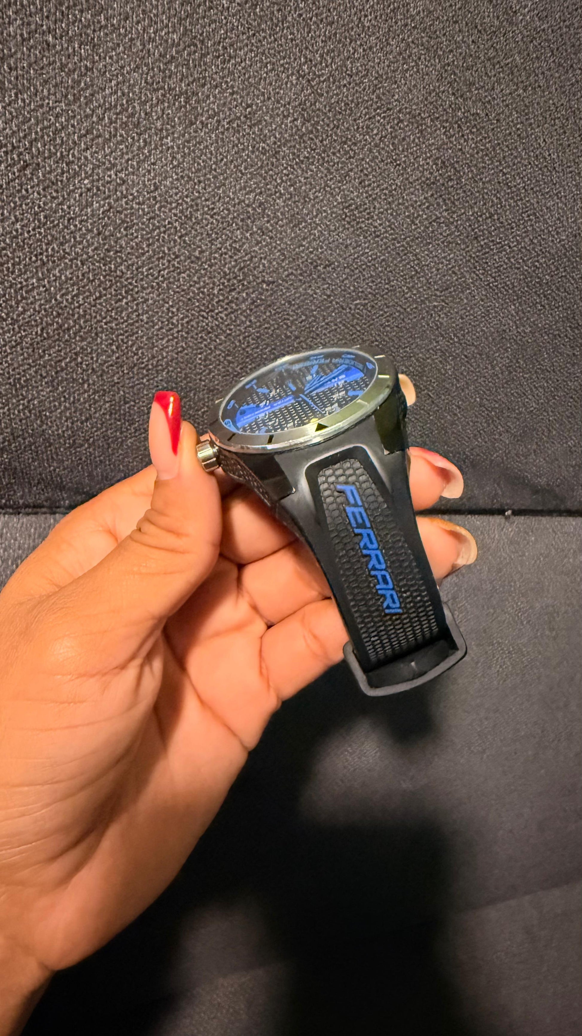 - Correa: Es de color negro, de un material que parece ser silicona o caucho, con el texto "SCUDERIA" visible en azul.